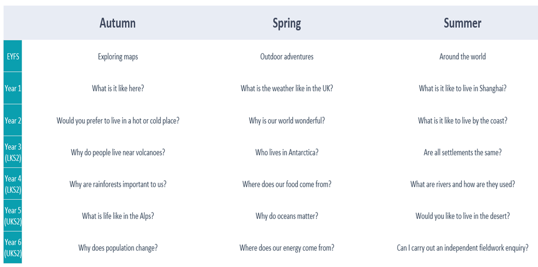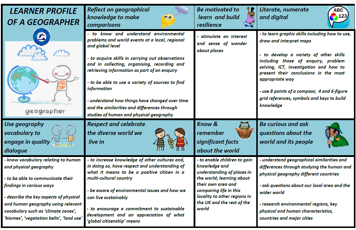 The scheme aims to build an awareness of how Geography shapes lives at multiple scales and over time. The hope is to encourage pupils to become resourceful, active citizens who will have the skills to contribute to and improve the world around them.